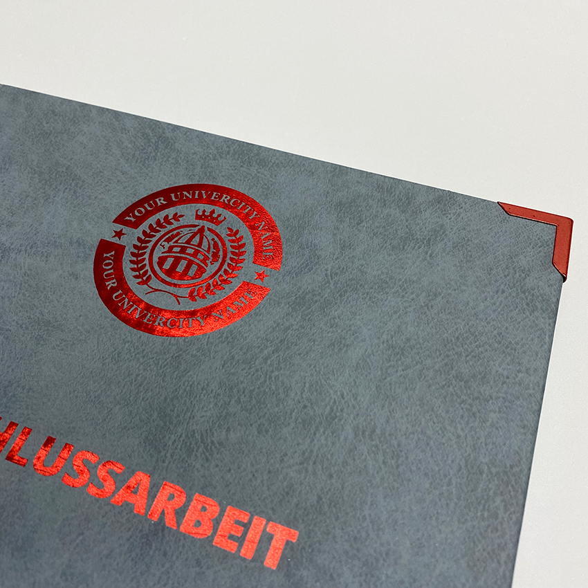 Diese Hardcover Bindemappe "Kunstleder" hat einen Einband mit einer Oberfläche aus sehr hochwertigem, exklusivem und glattem Kunstleder. Das Kunstleder ist leicht marmoriert und bietet somit ein sehr individuelles Auftreten. Das exklusive Erscheinungsbild der Bindemappe hebt sich von vielen anderen Mappen ab und es verleiht Ihren Abschlussarbeiten eine einmalige Note. Bei dieser Oberfläche ist ein ganzseitiger Coverdruck möglich, nähere Informationen zum Erstellen der Datei finden Sie unter dem Punkt "Information zum Druck".