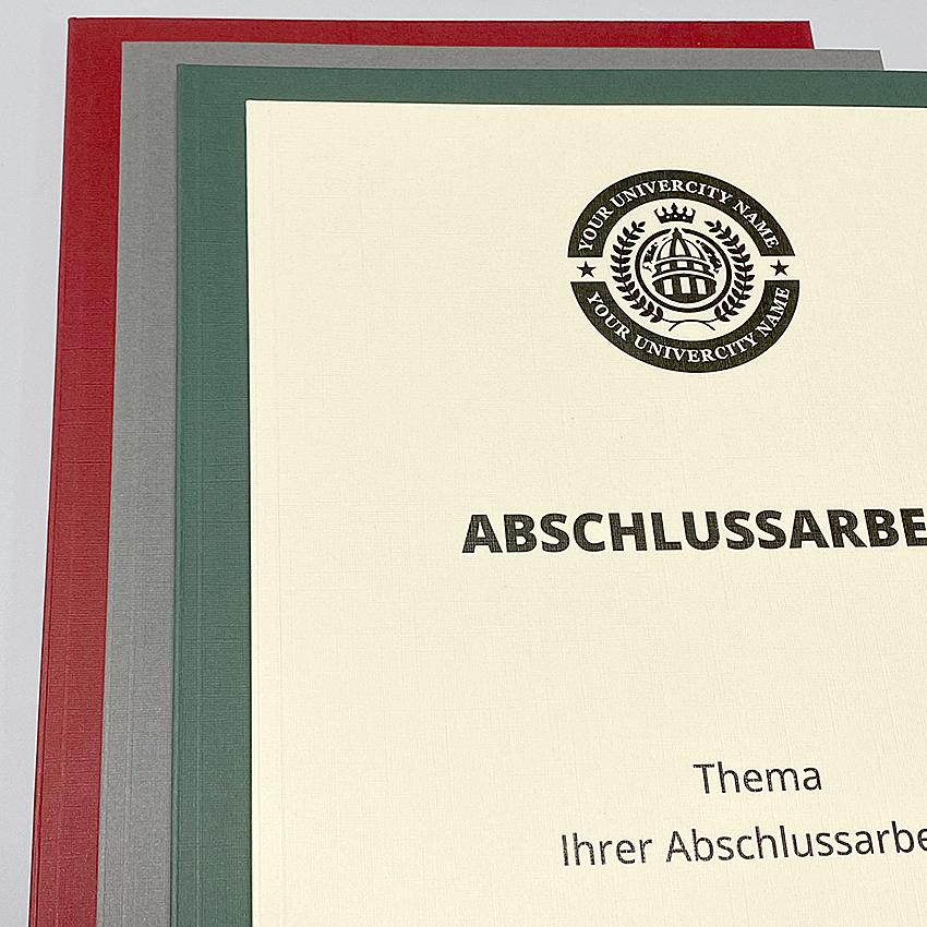 Gedruckt werden Ihre Abschlussarbeiten auf einem reinweißem, leicht gestrichenem Qualitätspapier in den Grammaturen 100g/m2 und 120g/m2. Durch dieses Papier bekommen Ihre Arbeiten ein eindrucksvolles Ergebnis, mit originalgetreuen Farben und gestochen scharf gedruckten Abbildungen und Texten. Bei der Papierstärke 100g/m2 bieten wir auch eine matte Oberfläche an, dieses Papier ist für Arbeiten OHNE Bilder, Fotos oder Grafiken geeignet.