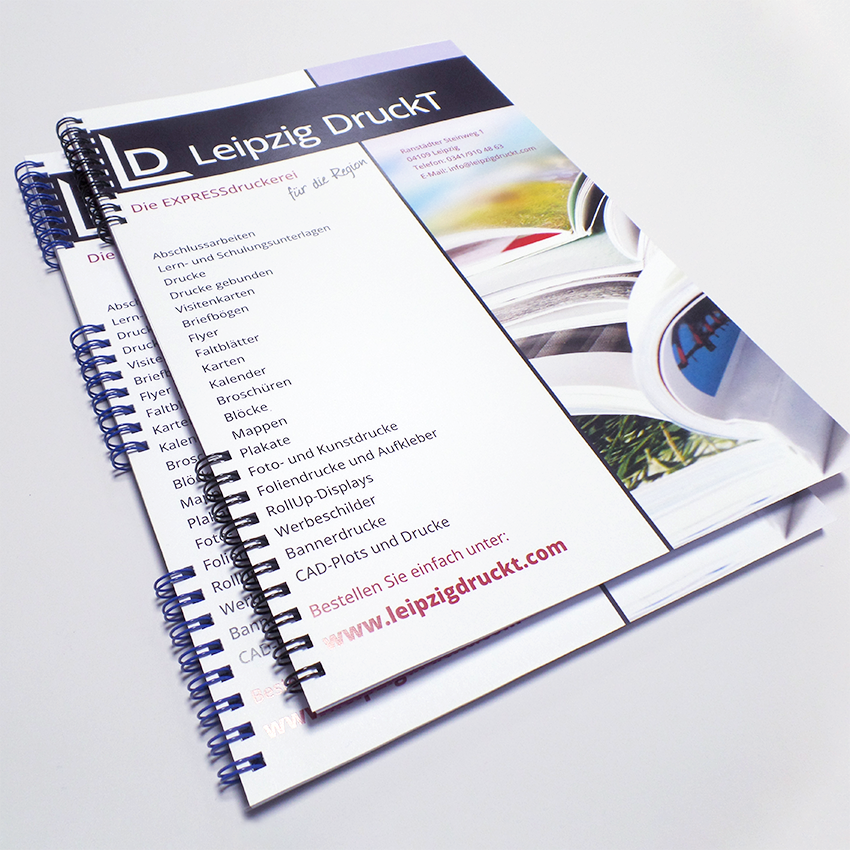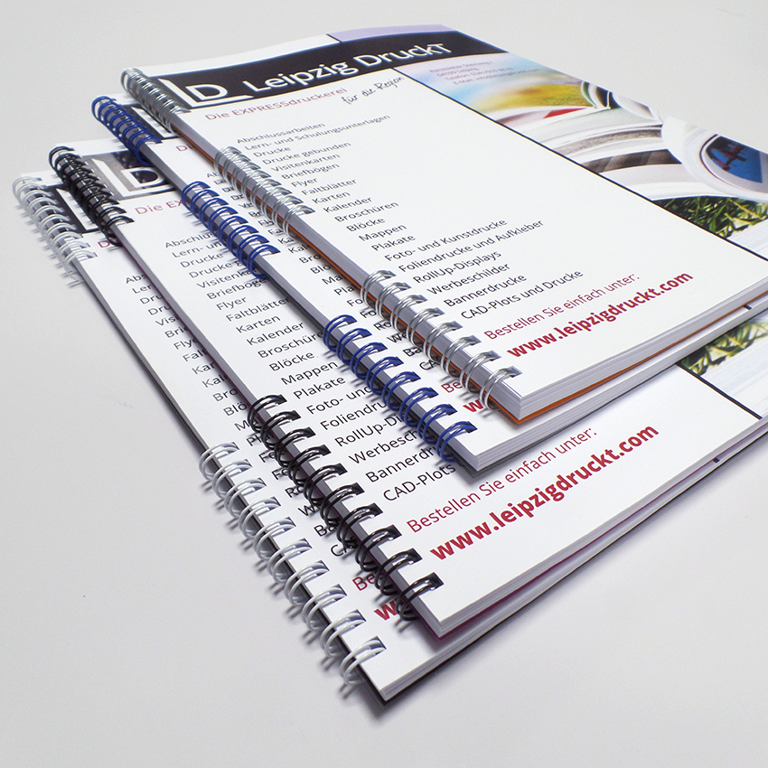 Unter dieser Kategorie können Sie Drucke mit einer Drahtringbindung, einem festen Umschlag und als Skip-Bindung bestellen. Die Drahtringbindung bieten wir bei diesem Produkt als Skip-Bindung, entweder zwei- oder dreigeteilt an. Sie besteht aus einem Drahtringbindekamm und einem festen Karton vorn und hinten, mit oder ohne Schutzfolie. Es gibt verschiedene Farben der Bindekämme, verschiedene Stärken und Farben des Kartons für vorn und hinten.