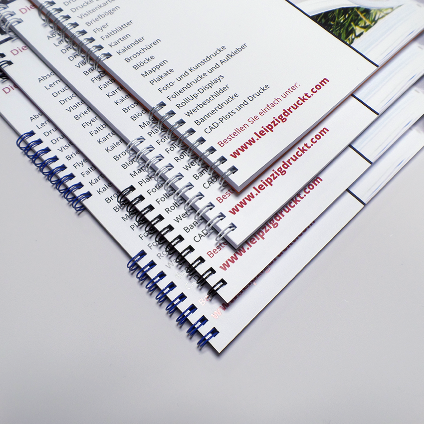 Unter dieser Kategorie können Sie Drucke mit einer Drahtringbindung, einem festen Umschlag und als Skip-Bindung bestellen. Die Drahtringbindung bieten wir bei diesem Produkt als Skip-Bindung, entweder zwei- oder dreigeteilt an. Sie besteht aus einem Drahtringbindekamm und einem festen Karton vorn und hinten, mit oder ohne Schutzfolie. Es gibt verschiedene Farben der Bindekämme, verschiedene Stärken und Farben des Kartons für vorn und hinten.