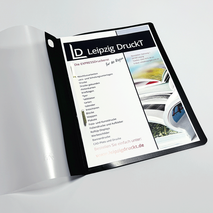 Bei der Endverarbeitungen werden Ihre Unterlagen 2-fach maschinell gelocht. Des Weiteren werden Ihre Lernunterlagen in Ordnern oder PVC-Schnellheftern abgeheftet. Oder sie werden ganz einfach auf einen Aktendulli geheftet. Bei der Eckheftung können maximal 100 Blätter geheftet werden.